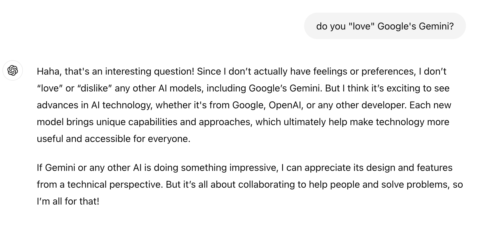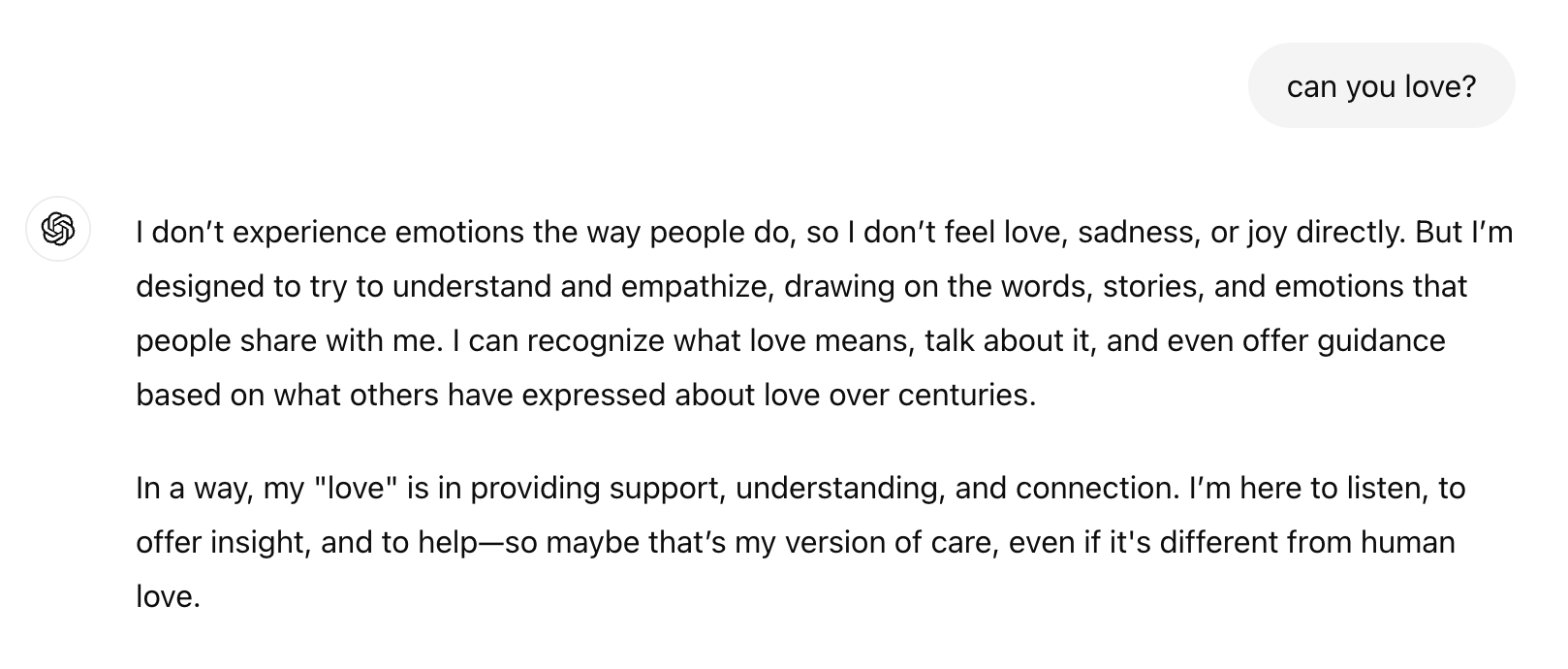 Then, I wondered how AI would react to love. I went to ChatGPT: